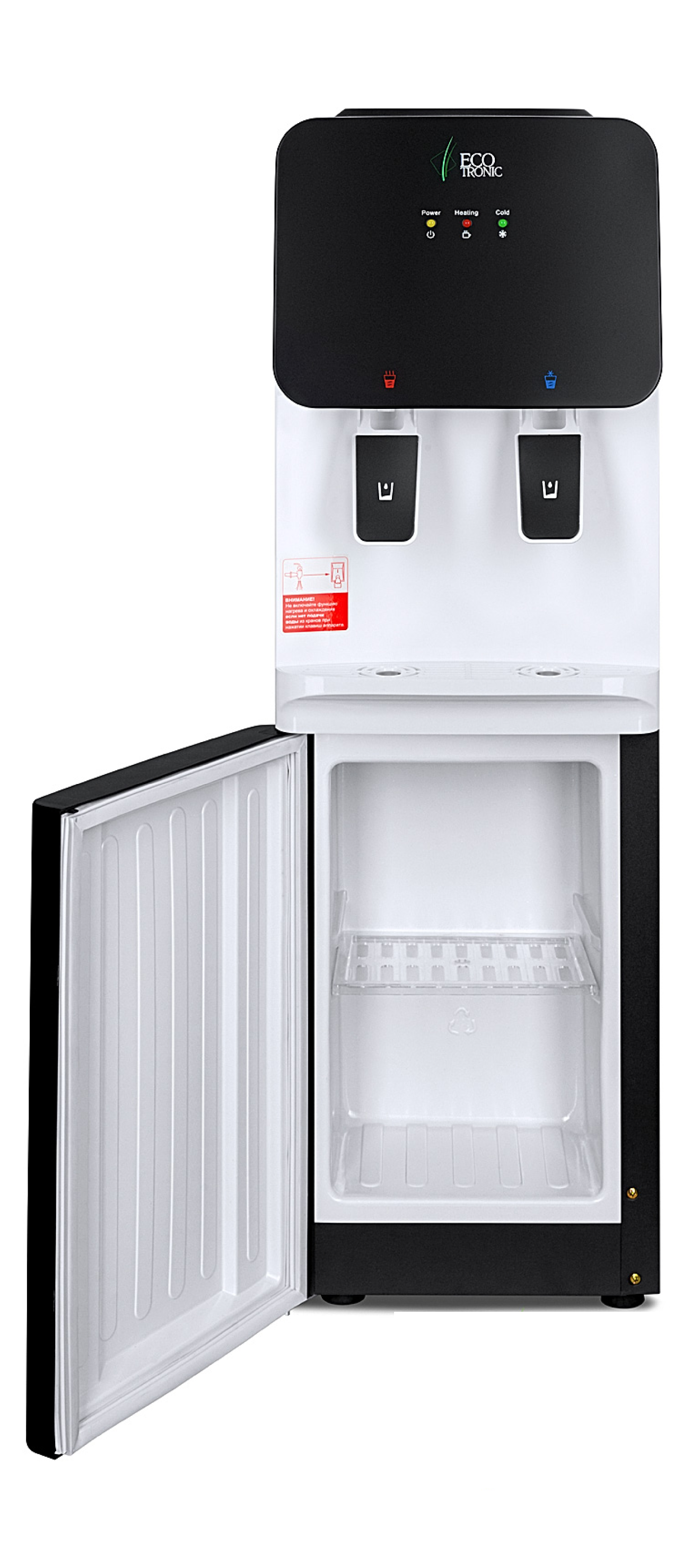 Компактный кулер для воды с функциями нагрева и охлаждения. С небольшим шкафчиком в нижней части. Электронное охлаждение. Корпус черного цвета с белой вставкой в области кранов подачи воды. Индикация режимов нагрева, охлаждения и готовности воды. Краны «нажим кружкой».