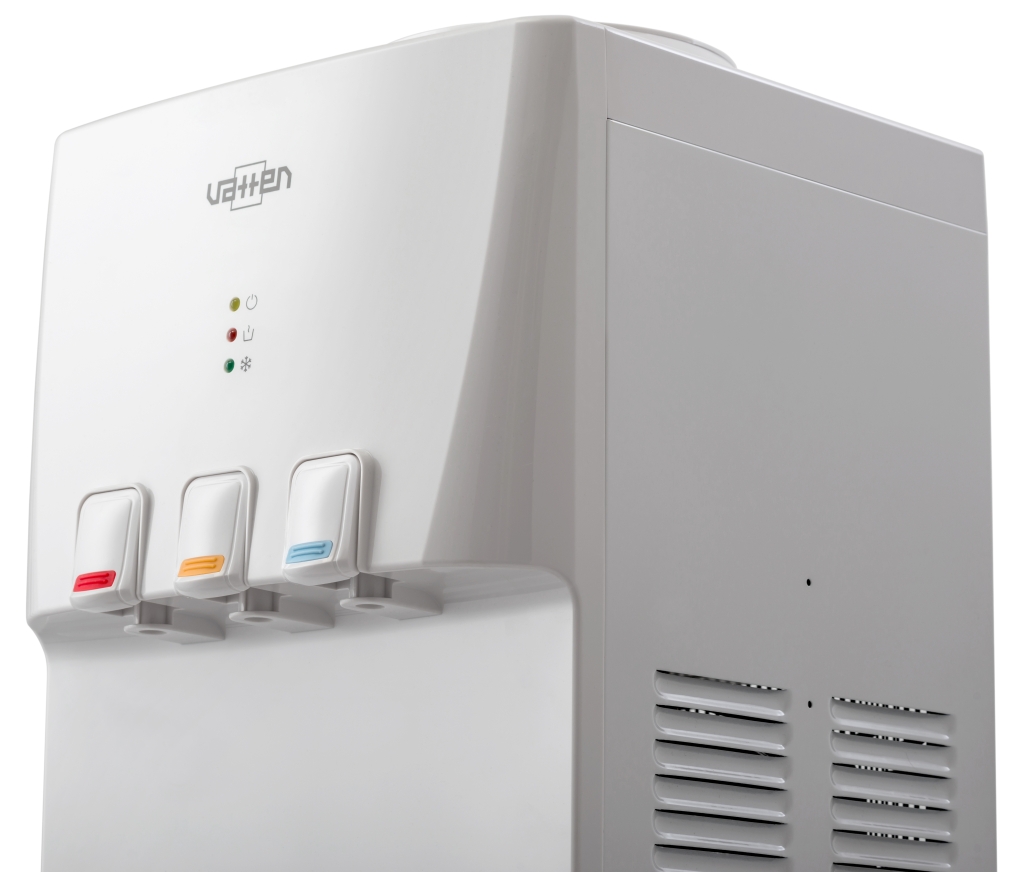 Напольный кулер для воды Vatten V46WKB с компрессорным охлаждением и высокой производительностью нагрева воды - до 6 литров в час (мощность водонагревателя 650 Вт). Шкафчик - холодильник 20л. Кулер прекрасно подойжет для дома и для офиса. Три крана, управление кнопками - горячая, холодная и вода комнатной температуры. Цвет корпуса белый. Бутылеприёмник, верхняя и передняя панели изготовлены из высококачественного, устойчивого к ультрафиолету ABS пластика. Боковые панели стальные. Баки горячей и холодной воды из нержавеющей стали. Три LED индикатора (включение питания, индикатор нагрева, индикатор охлаждения).