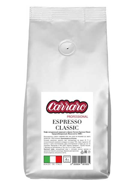 Carraro Espresso Classic кофе в зернах вакуумная упаковка 1 кг.
